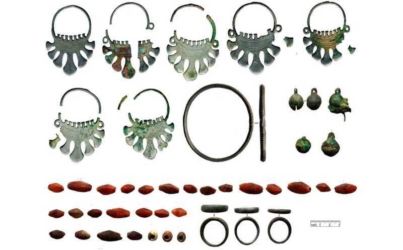 Вещи из погребения женщины в кургане Кременье: височные кольца, браслет, бубенчики и перстни из медного сплава, сердоликовые бусины.